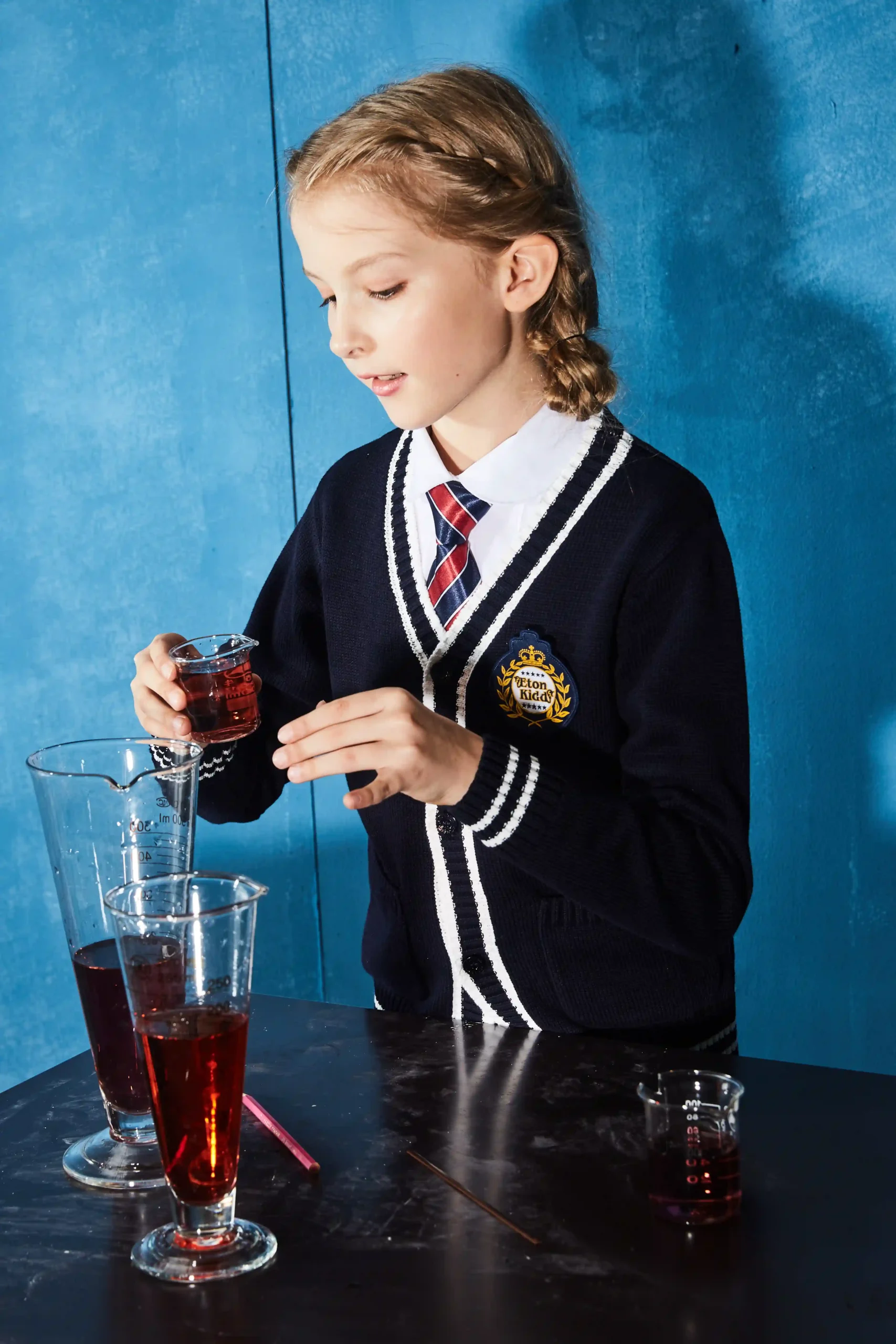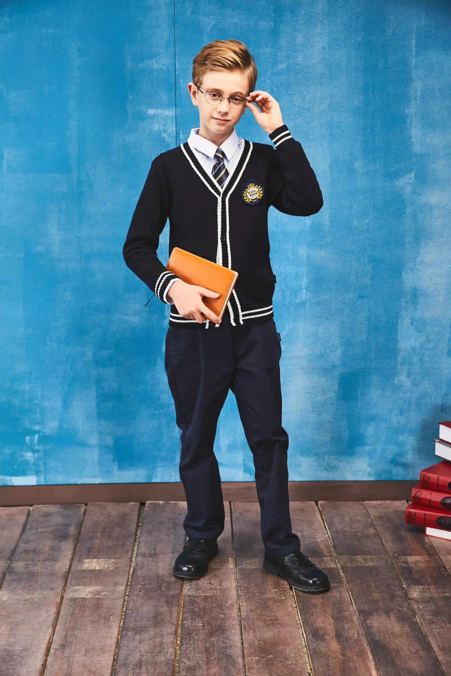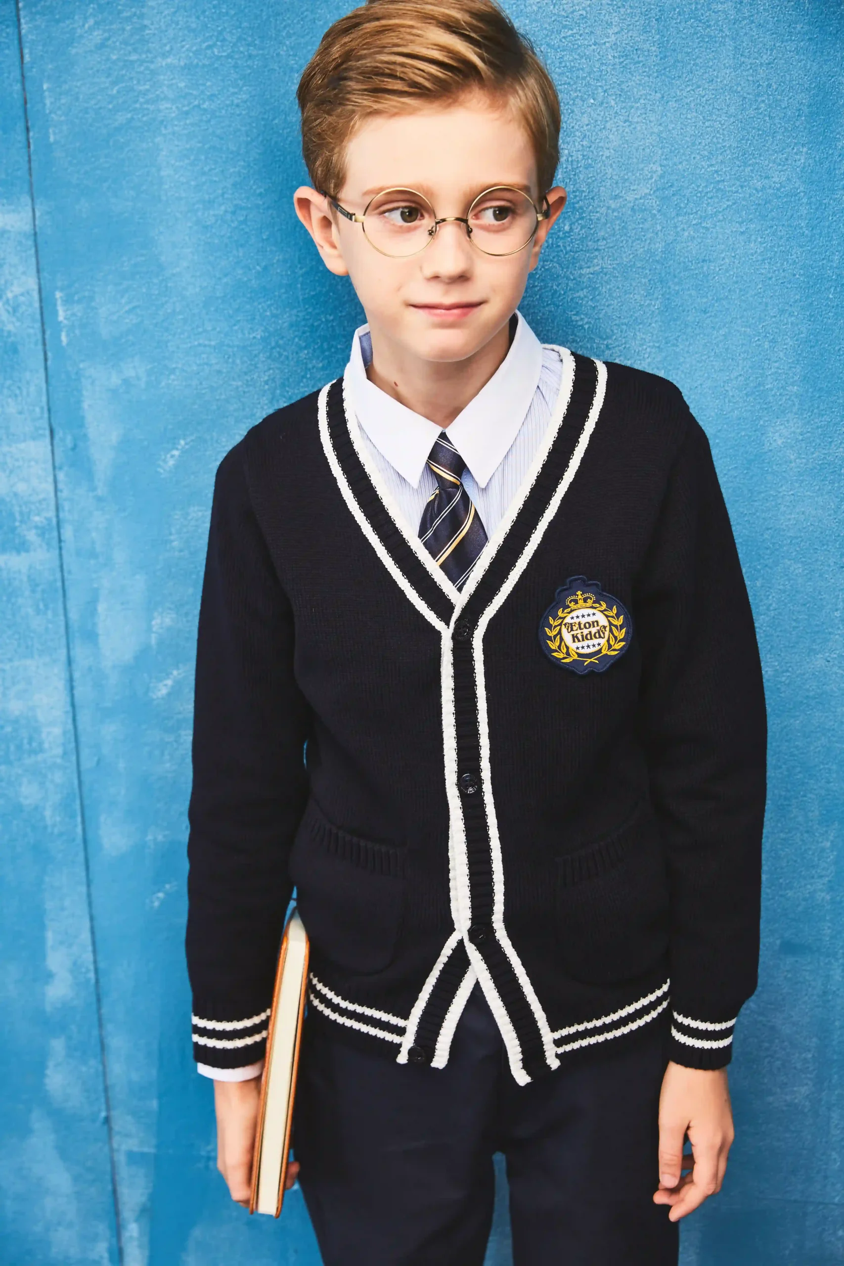 The sweater’s medium-weight construction makes it ideal for layering, offering warmth without bulk. Its soft, skin-friendly fabric ensures comfort even during long periods of wear, while the structured silhouette maintains a polished and tidy appearance. The combination of practical functionality, classic academic styling, and high-quality materials makes this sweater a versatile and reliable addition to any student or young professional’s wardrobe.