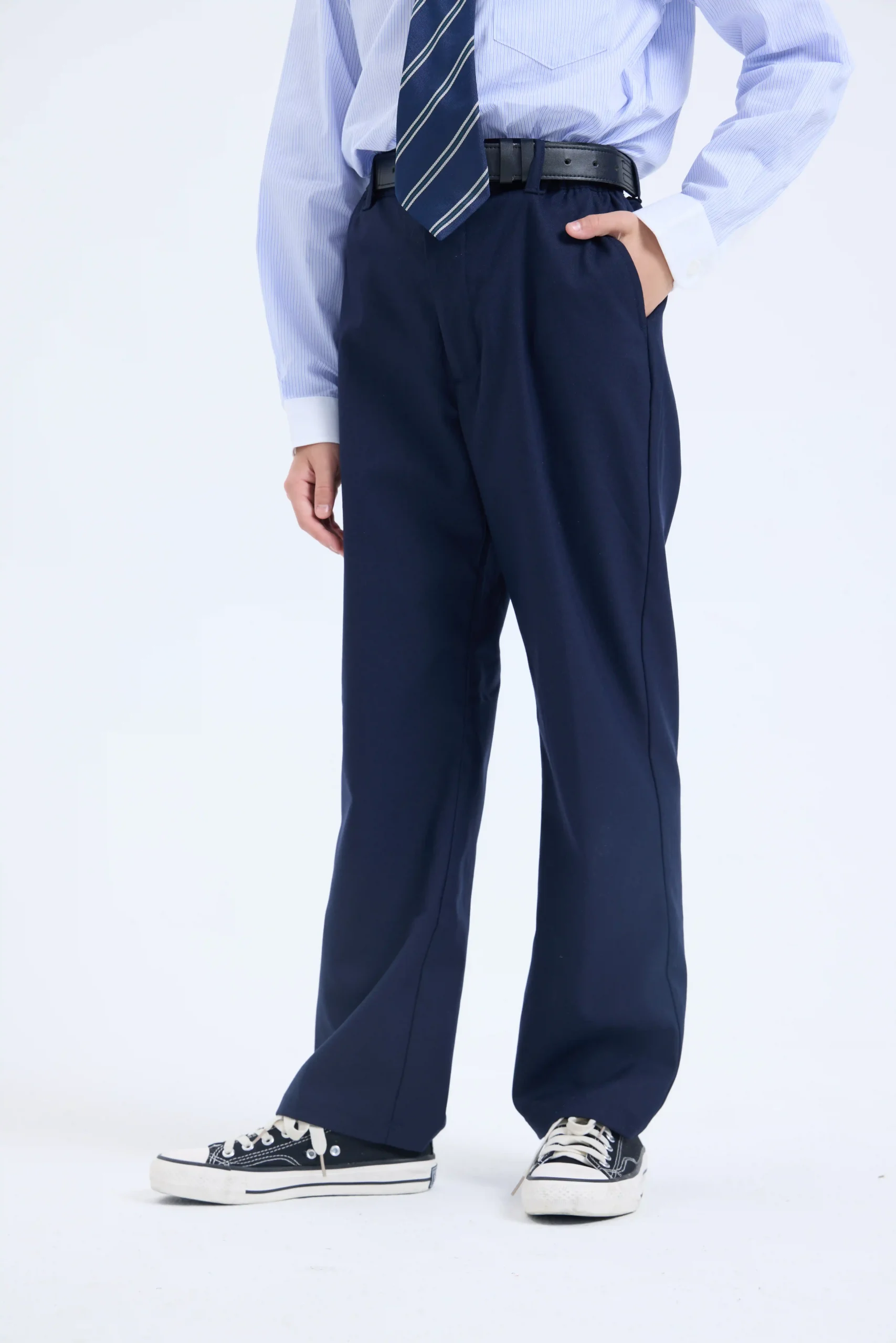 The Academic Boys' Long Pants combine classic school uniform style with practical design, offering both comfort and durability for everyday wear. Featuring clean, angled side pockets and a neatly tailored rear waistband, these pants provide a polished appearance suitable for academic settings. The waistband is intelligently segmented by age group, ensuring an ideal fit for children of various sizes. Crafted from breathable, slightly stretchy fabric, these trousers maintain shape while allowing ease of movement, making them an essential piece for active school life.