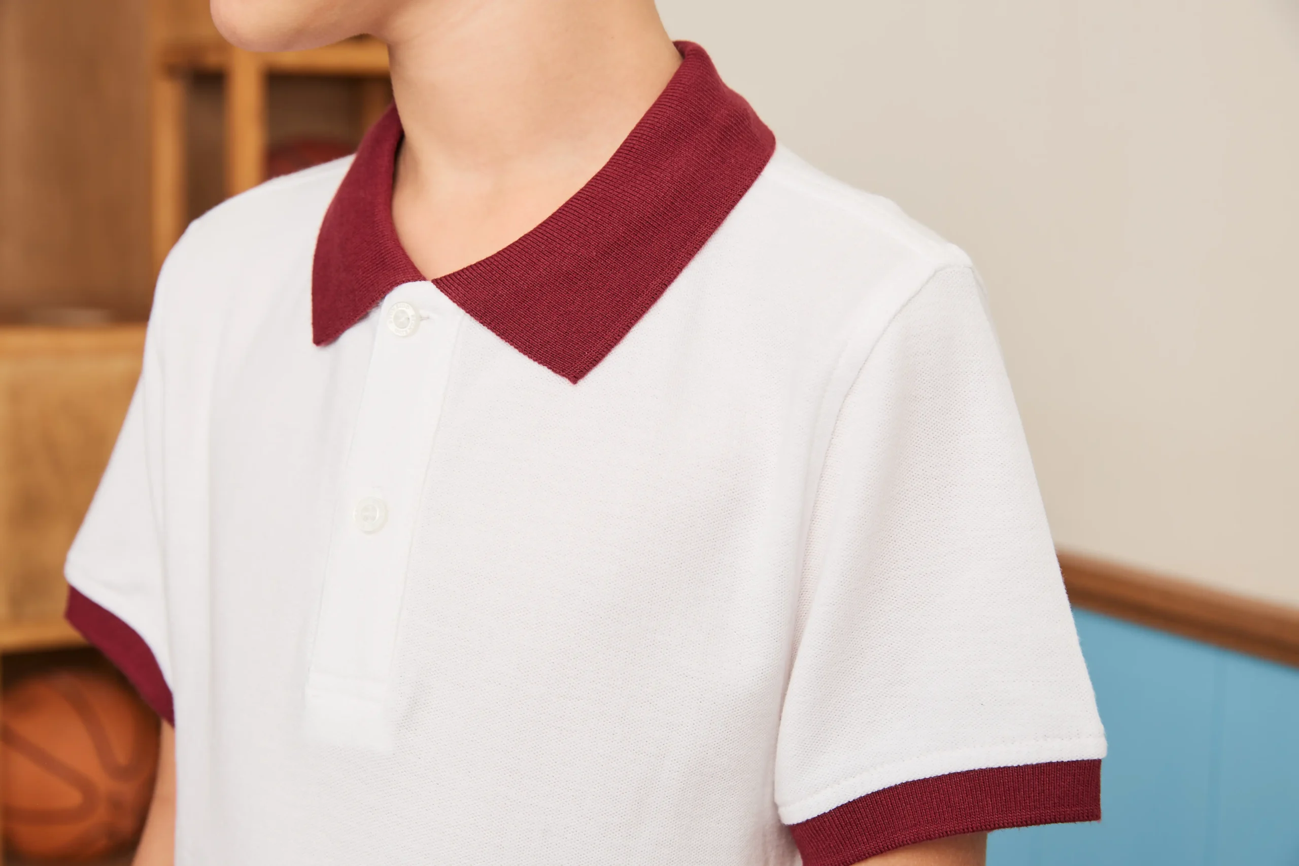 | Color | White with navy blue collar | White with dark green collar | White with burgundy collar | Light heather gray with navy blue collar |