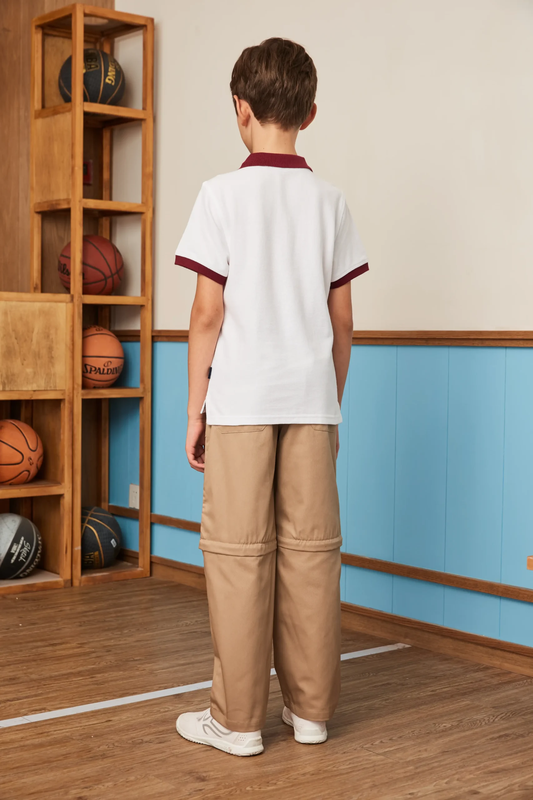 Every element of the British Collegiate Short-Sleeve T-Shirt has been designed with precision. The honorary tricolor webbing placket stands out as a central design feature, symbolizing both collegiate pride and a bold visual statement. The collar, knitted in a color-blocked rib pattern, offers superior comfort while retaining its form through regular wear. Vented side slits are integrated into the hem, allowing increased mobility and contributing to a more structured drape. The cuff design, also color-blocked, introduces a distinctive element that reinforces the shirt’s youthful, preppy personality. Small but important touches such as the branded hangtag and care label underline the garment’s professional finish and attention to detail. Together, these features not only enhance the shirt’s aesthetic but also ensure durability and reliability in daily use.