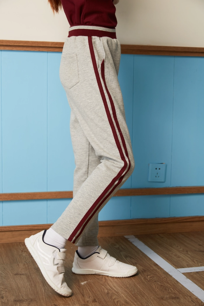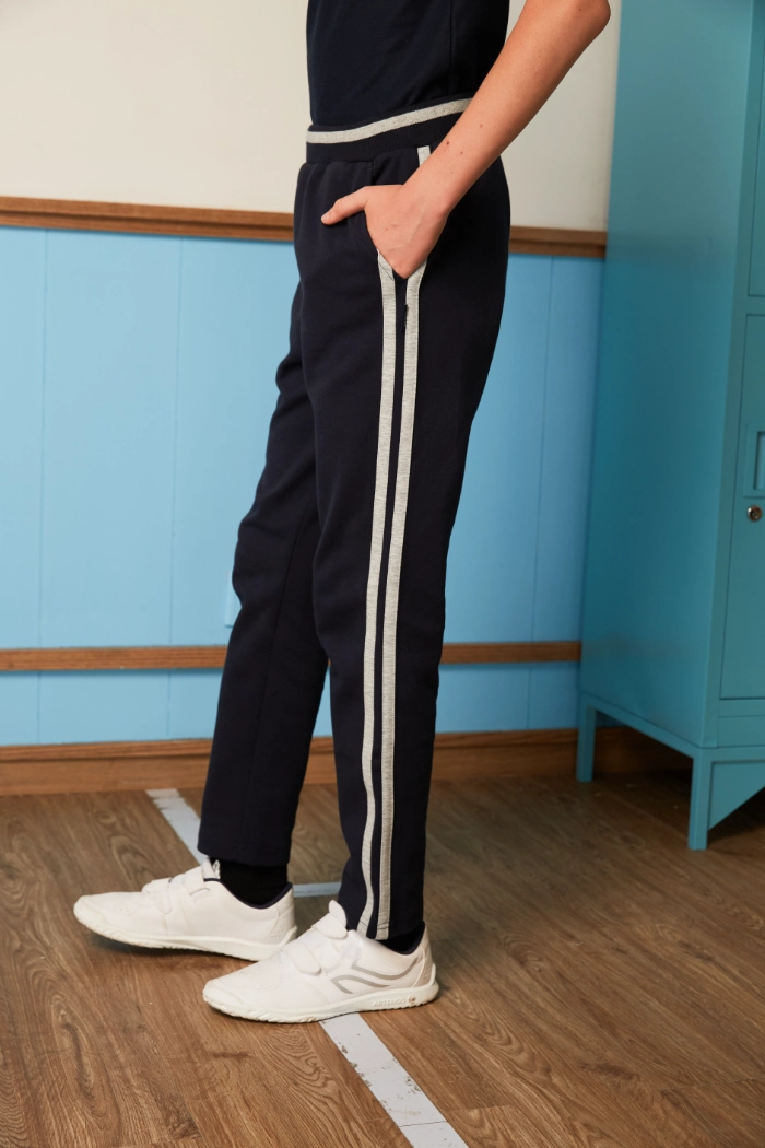 The British Gentleman stand collar sport top features a classic collegiate-inspired collar, offering subtle refinement while providing coverage and warmth around the neck. Reflective stripes along the raglan seams enhance visibility in low-light conditions, promoting safety during outdoor activities. Contrast-striped ribbing at the cuffs and hem provides a snug fit, ensuring the top stays in place while adding a stylish visual element. The slim-fit sport pants mirror the design details of the top, featuring matching contrast stripes along the side seams for a coordinated look. Double pockets on the pants allow for convenient storage of small items, combining functionality with athletic style. Both pieces include care labels and hang tags for easy maintenance and presentation.