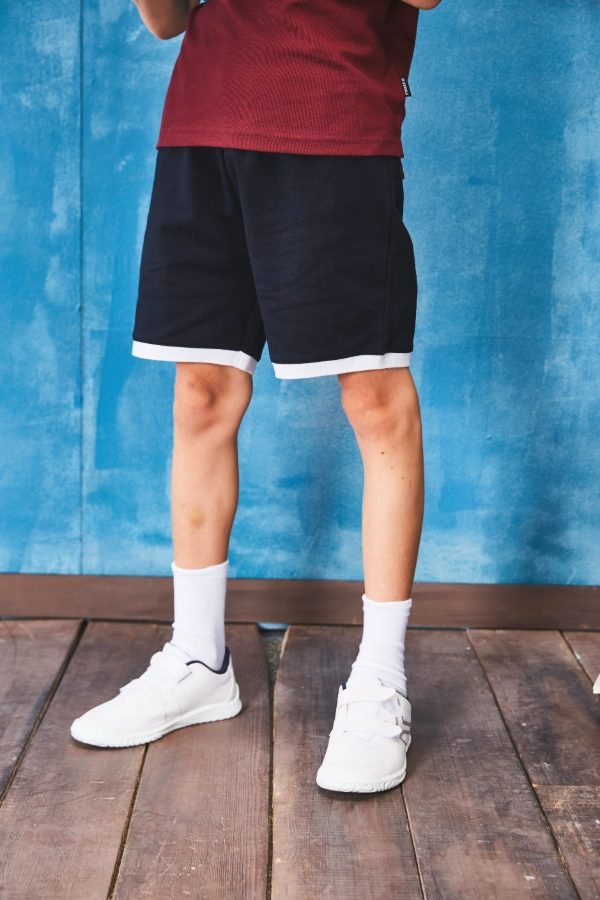 Constructed from high-quality terry knit fabric, these shorts blend cotton and polyester to create a material that is soft, breathable, and slightly stretchy. This combination provides comfort and ease of movement for active children, while also being durable and easy to care for. The slightly elastic nature of the fabric ensures that the shorts maintain their shape during rigorous play or repeated washing. Precision stitching and reinforced herringbone tape at the crotch enhance structural integrity and durability, preventing wear in high-stress areas. The white ribbed hem is both functional and stylish, maintaining the shorts’ silhouette while providing flexibility and freedom for movement.