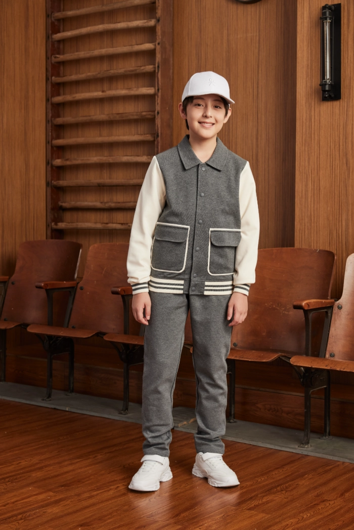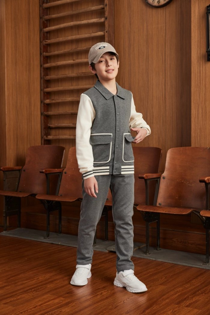 The Collegiate Knit Sport Top combines style, functionality, and comfort for active children. Crafted from air-layer cotton fleece, the cotton-polyester blend ensures a soft, breathable, and slightly stretchy fit that moves with the body. Its collegiate collar design, front four-snap placket, vibrant contrast color blocking, striped ribbed cuffs, and windproof ribbed hem deliver both practicality and sporty elegance. Thoughtful details such as contrast-trimmed patch pockets provide convenient storage while enhancing the visual appeal. Designed for outdoor play, casual sports, and everyday wear, this top offers children comfort, adaptability, and freedom of movement while reflecting a youthful, collegiate-inspired style.