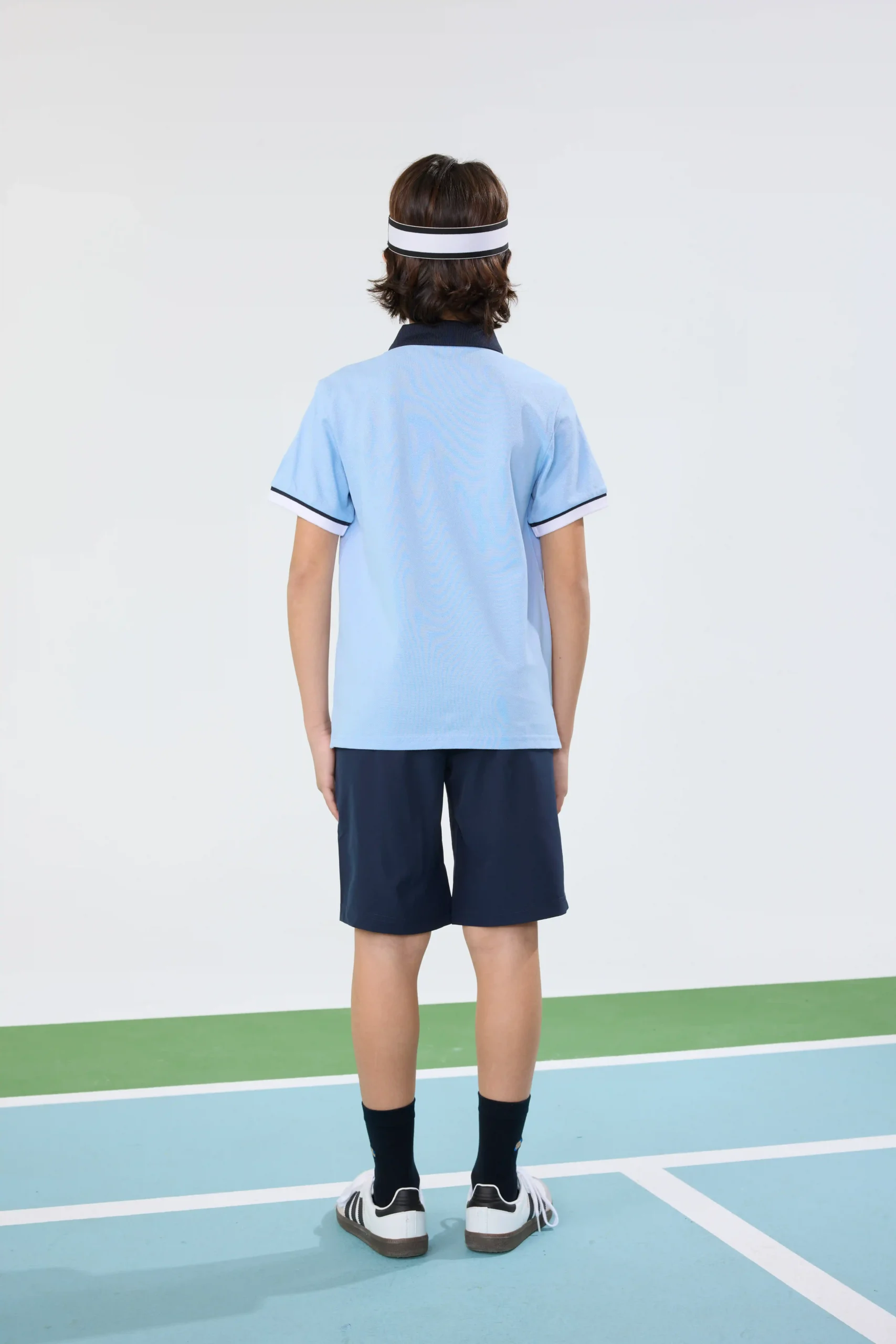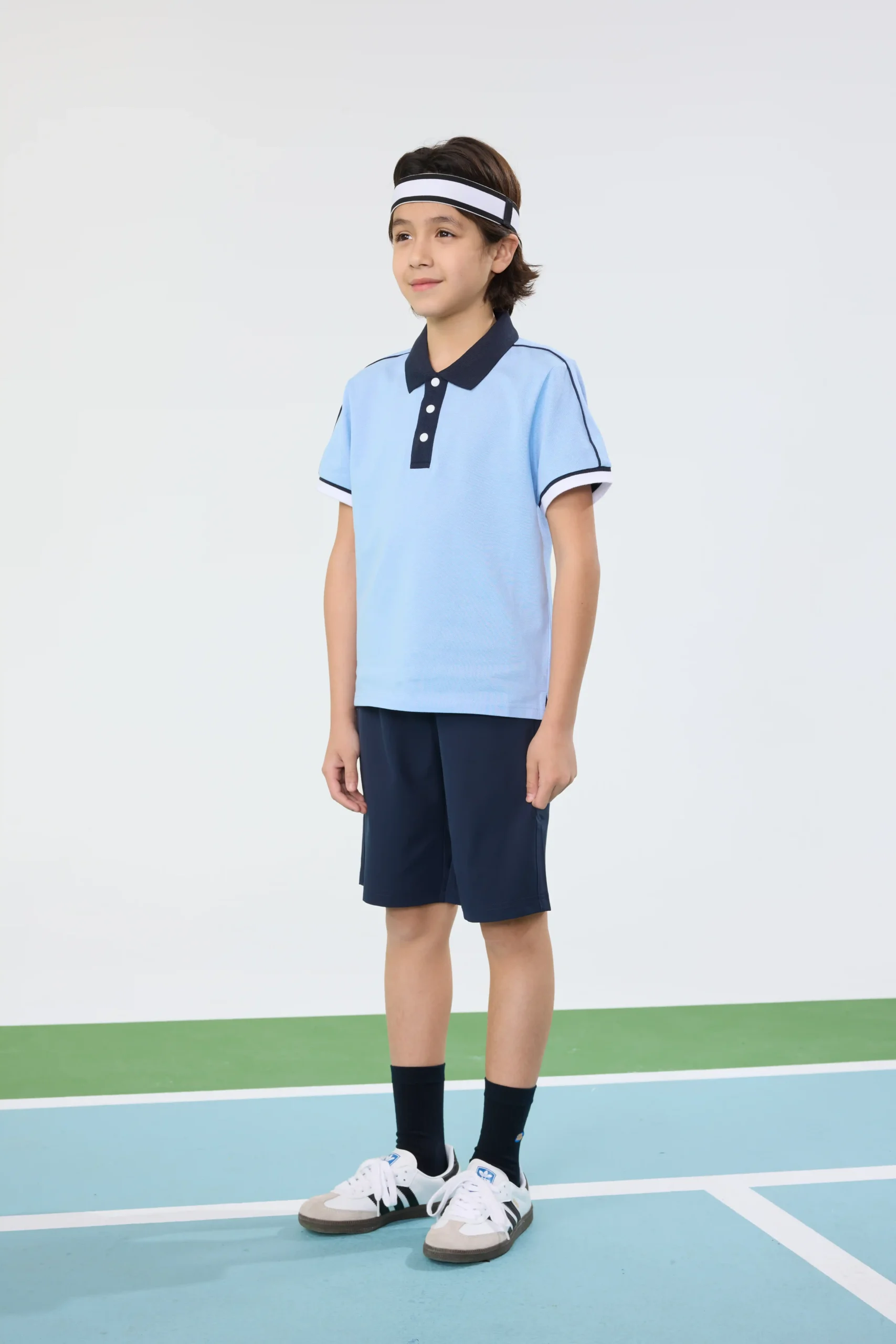 This collegiate short-sleeve T-shirt blends preppy charm with practical comfort, making it a versatile summer essential. Crafted from CVC piqué knit fabric, it offers the breathable softness of cotton with the resilience of polyester. Depending on the style, options include ice oxygen cool piqué mesh for a naturally refreshing touch, or eco-friendly piqué mesh for sustainable wear. The fabric’s slight stretch provides flexible movement while maintaining a crisp, structured fit. Details such as a color-blocked polo collar, contrast ribbed cuffs, refined piping, and a snap-button placket elevate the look, while dual side slits and a neatly topstitched hem ensure ease of movement and durability.