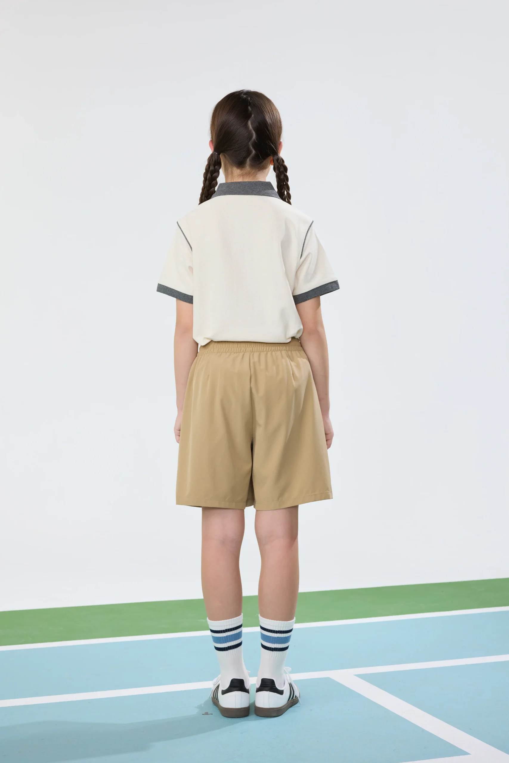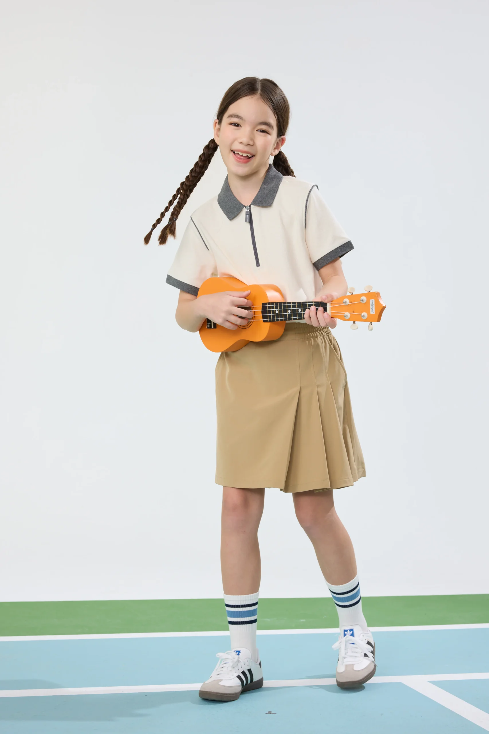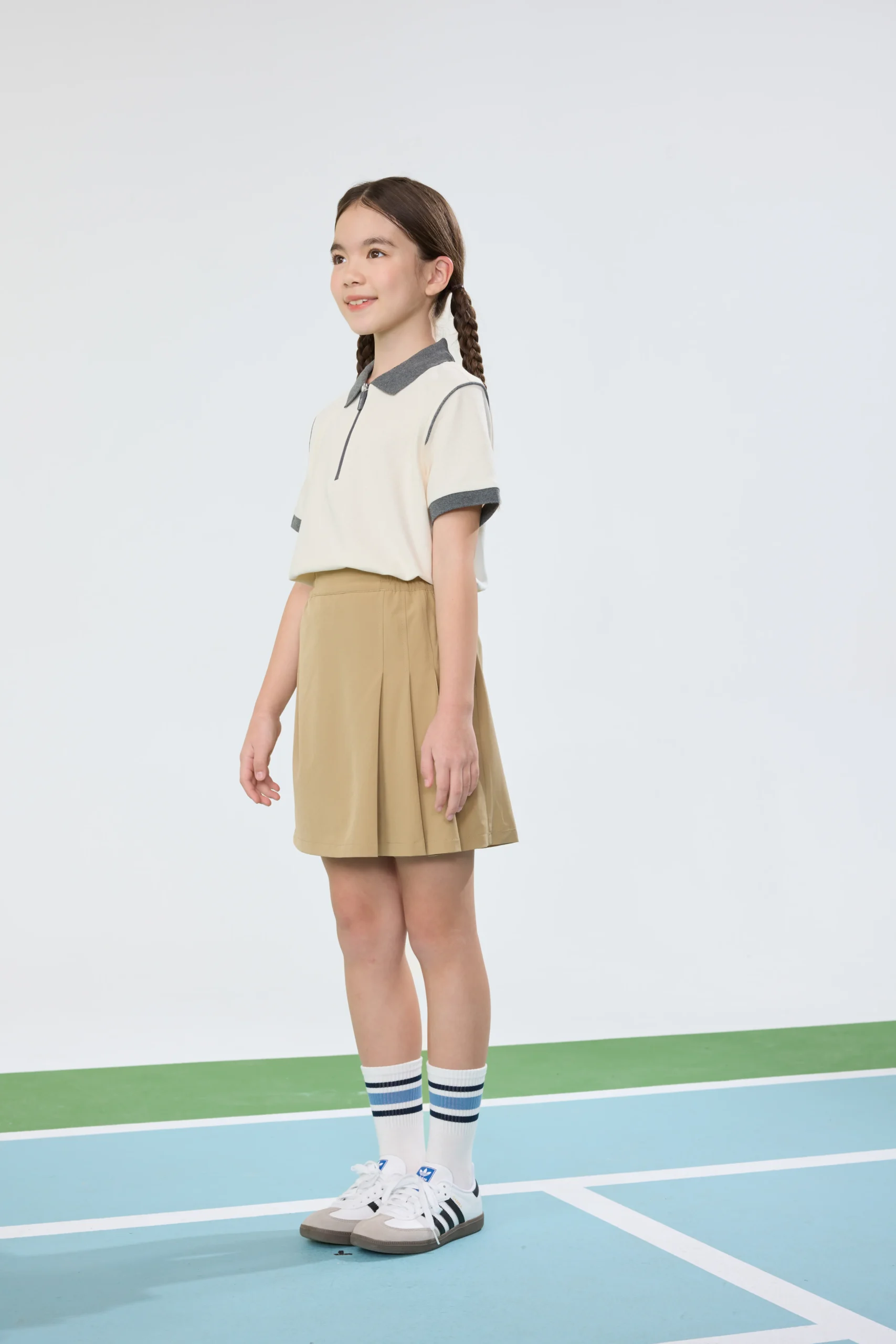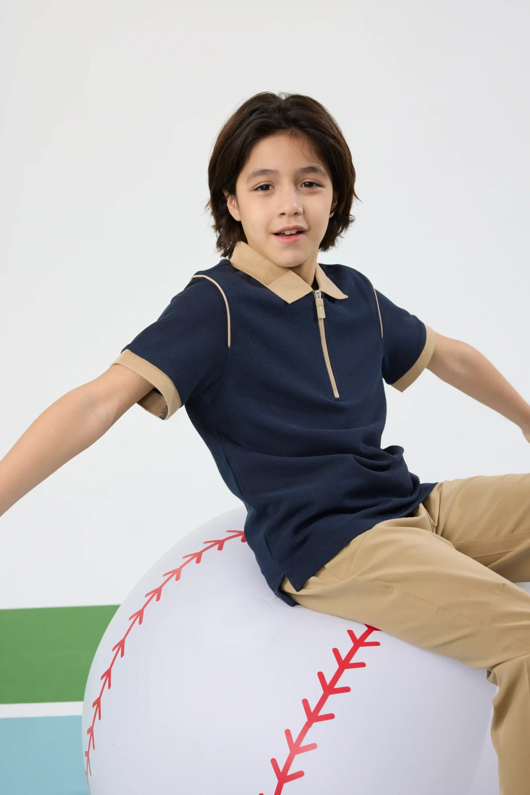 Design elements enhance both the aesthetic and functional aspects of the T-shirt. A front zipper placket offers a clean, contemporary look while simplifying dressing. The contrast-color collegiate polo collar adds a smart preppy touch, balancing casual ease with refined style. Delicate piping along the armholes highlights craftsmanship, adding subtle sophistication. Contrast ribbed cuffs secure the sleeves comfortably, maintaining a neat appearance. Side slits at the hem facilitate freedom of movement, enhancing comfort during walking, sitting, or light activity. Finally, the hem is finished with cover-stitching to reinforce durability and provide a clean, polished edge. Together, these features create a T-shirt that is visually appealing, functional, and versatile, suitable for both casual and semi-formal summer wear.