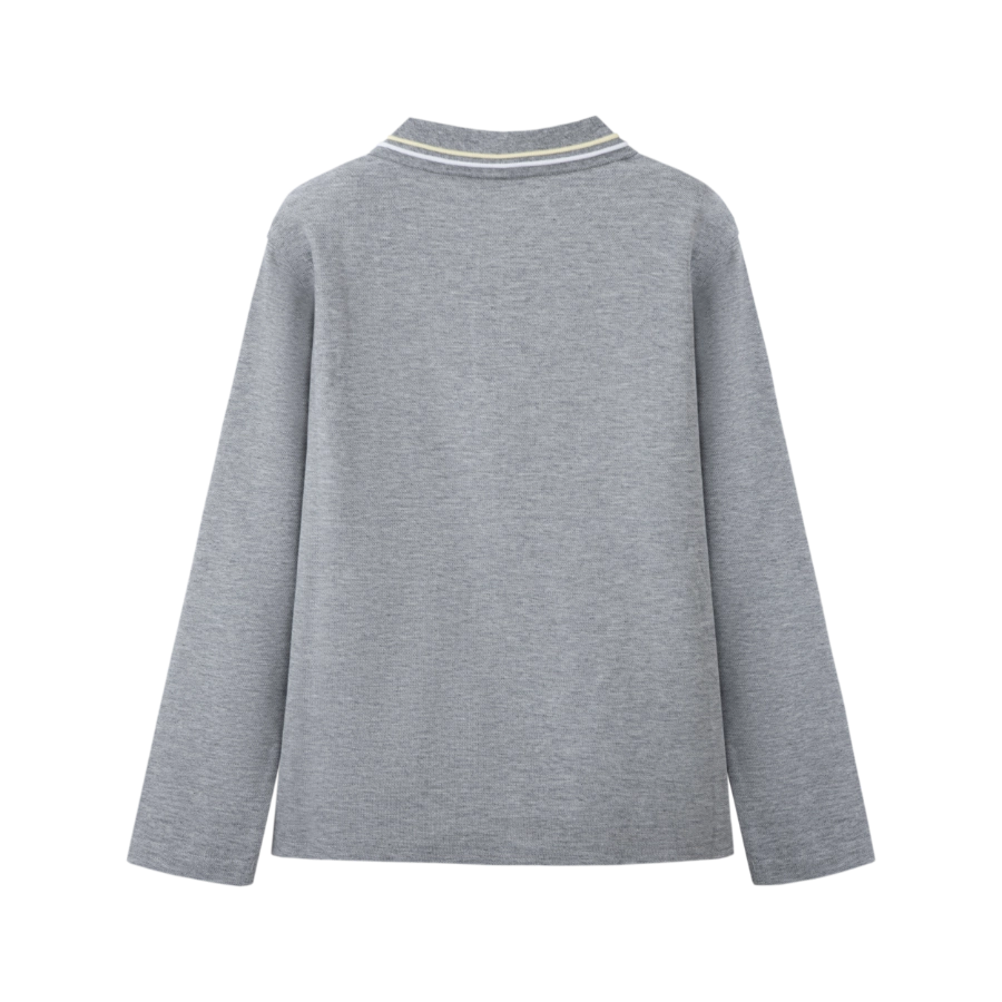 The Preppy Style Pique Knit Ribbed Collar Long-Sleeved T-shirt is a contemporary expression of academic elegance and modern comfort. Inspired by the timeless charm of traditional school uniforms, it fuses classic tailoring with modern craftsmanship to create a piece that feels both refined and relaxed. The design celebrates the “New Impression of Campus” concept—an evolution of preppy aesthetics that draws inspiration from Western orderliness and Eastern harmony. Every detail, from the cut of the ribbed collar to the soft texture of the fabric, is thoughtfully balanced to convey confidence, youth, and sophistication. This long-sleeved polo-style T-shirt introduces a refreshing interpretation of collegiate wear, offering the perfect blend of formality and ease for today’s students and professionals seeking an effortlessly neat look.